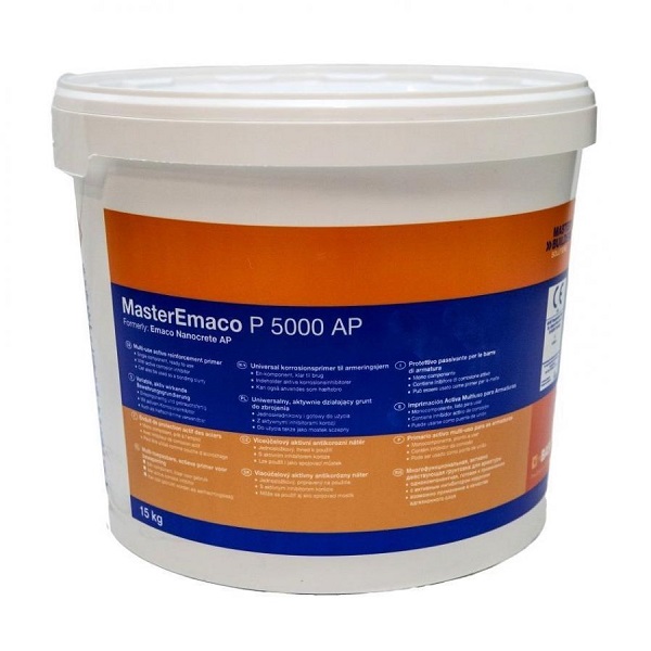 Материал MasterEmaco P 5000 AP (активный праймер) имеет двойное действие: с одной стороны, вновь восстанавливает высокую щёлочность, и таким образом пассивирует стальную арматуру, а с другой стороны, активно действующие ингибиторы долговременно защищают арматуру. Кроме того, материал может использоваться в качестве универсального адгезионного состава для всех ремонтных материалов серии MasterEmaco.