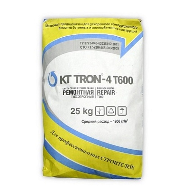 КТ трон-4 Т600 – сухая смесь, состоящая из цемента, минерального заполнителя, армирующих волокон и модифицирующих добавок. При смешивании с необходимым количеством воды образует быстротвердеющий тиксотропный раствор с высокой степенью адгезии к арматуре и ремонтируемому основанию. После отверждения приобретает цементно-серый цвет.