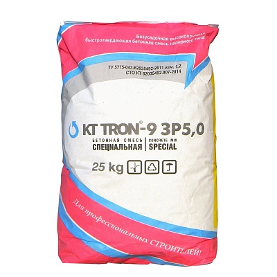 КТ трон-9 ЗР 5,0 – сухая смесь, состоящая из цемента, минерального заполнителя, армирующего волокна и модифицирующих добавок. При смешивании с водой образует безусадочный, самоуплотняющийся литьевой раствор с высокой степенью адгезии к арматуре и ремонтируемому основанию. После отверждения приобретает цементно-серый цвет.