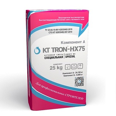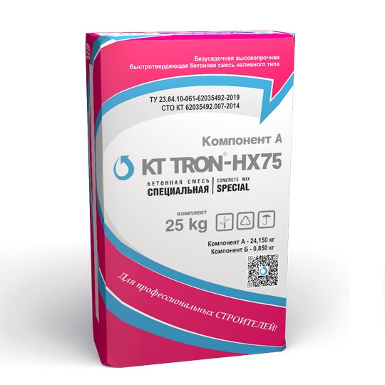 КТ трон-НХ75 – сухая смесь, состоящая из цемента, минерального заполнителя, армирующего волокна, металлической фибры и модифицирующих добавок. При смешивании с водой образует быстротвердеющий, реопластичный, безусадочный, самоуплотняющийся литьевой раствор с высокой степенью адгезии к арматуре и ремонтируемому основанию. После отверждения приобретает цементно-серый цвет.